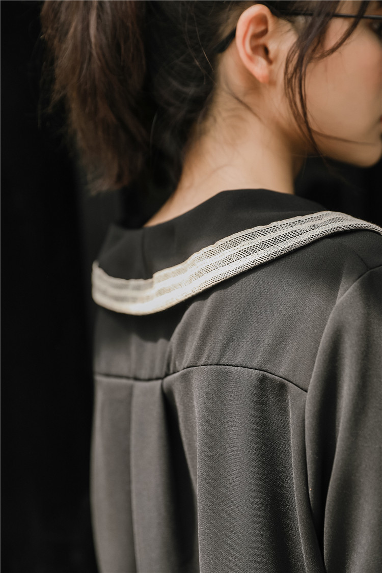 襟の淵周りにはレースをほどこし、ガーリーな要素もプラスしつつ、