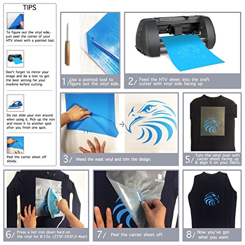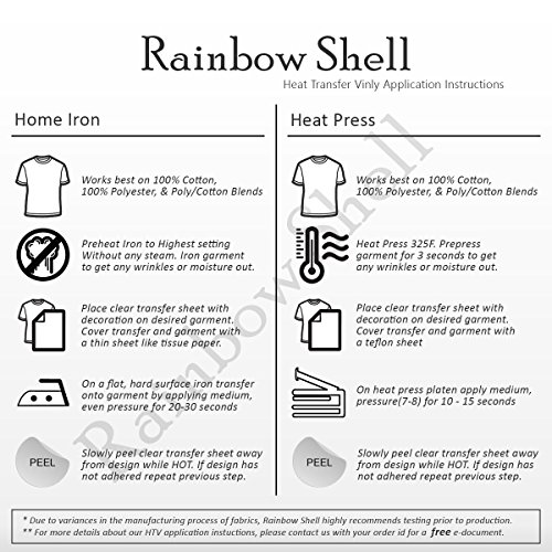 - ESAY TO USE: Don’t know how to apply it? It’s easy! Rainbow Shell’s HTV vinyl sheets are easy to iron and weed, making it ideal for the first timer, with a clear adhesive layer that keeps the vinyl in place during weeding, positioning and ironing. Also 12" x 10" sheets are easier to manage than vinyl rolls and easier to cut detailed designs. You will enjoy working with the HTV sheets.