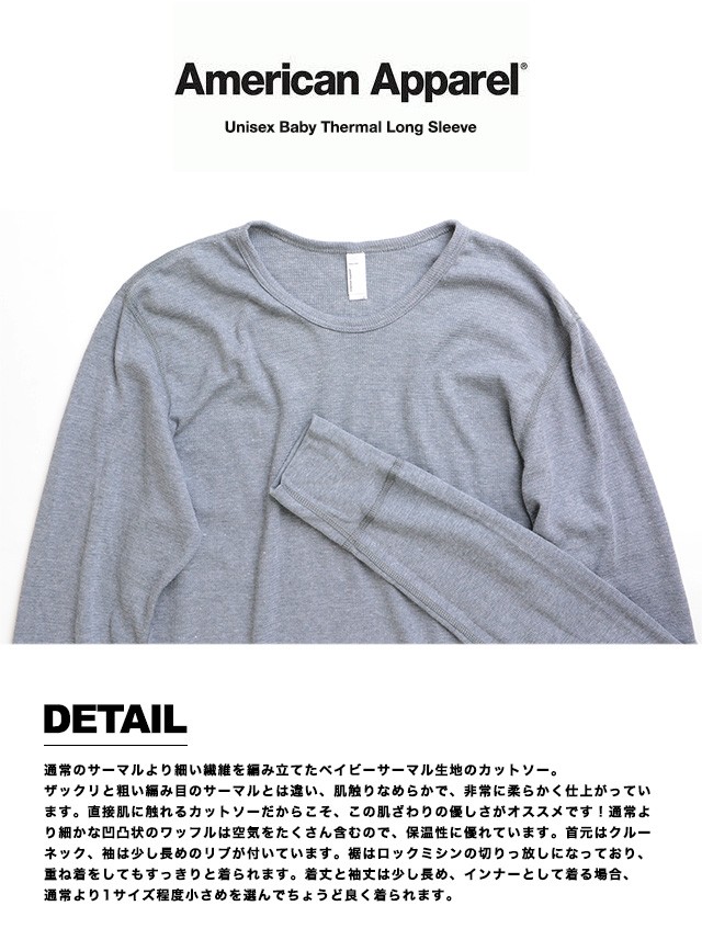 | 商品名 | American Apparel アメリカンアパレル アメアパ 長袖 Tシャツ サーマル T407 Unisex Baby Thermal Long Sleeve ロンT メンズ レディース | ||