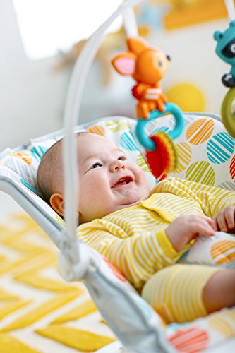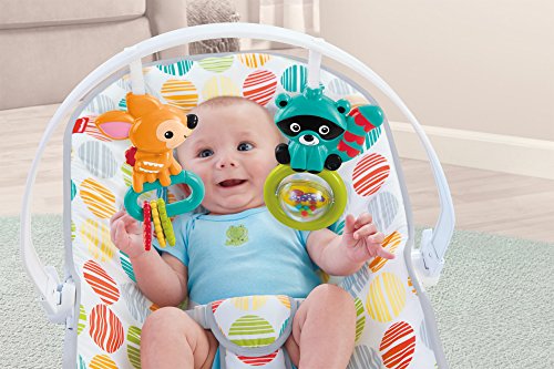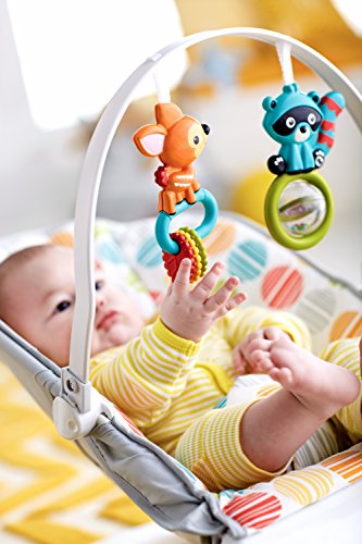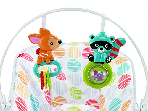 -. Feature : Removable toy bar with dangling raccoon spinner and baby deer clacker ring toys / Machine-washable seat pad / Adjustable three-point restraint / Modern, non-skid design / Requires 1 D battery