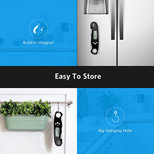 - BUILT-IN MAGNET & BACKLIGHT: Magnetic Attachment & Hanging Hole provide much more choices for the kitchen thermometer to be carried or stored. White backlight offers a soft reading background. Please feel free to contact us if you are not satisfied with it. We provide 100% Money Back and ONE YEAR Guarantee.