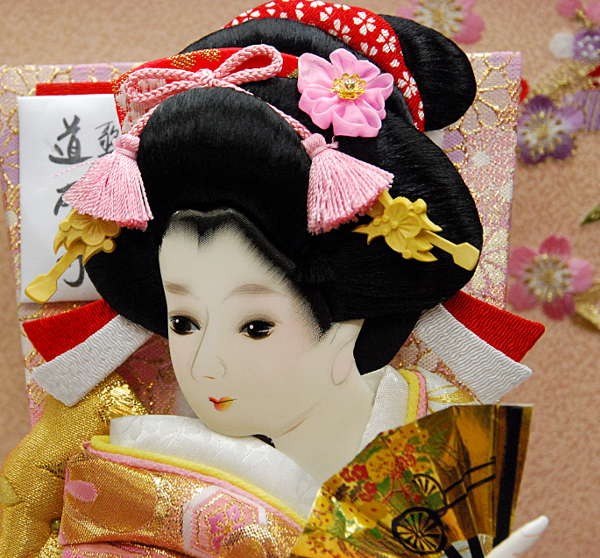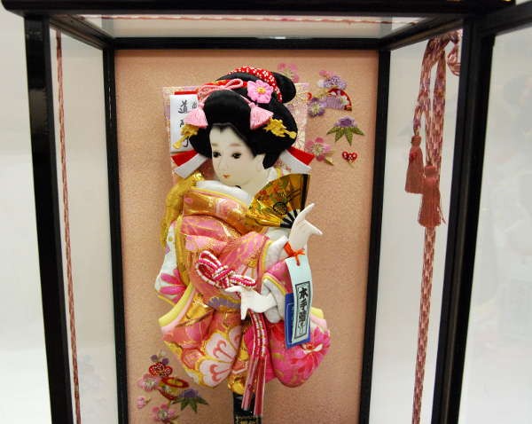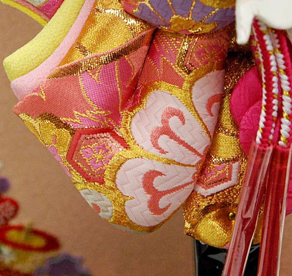 ピンク色絞りの正絹(シルクの)の衣装を着た 人気の羽子板飾りです