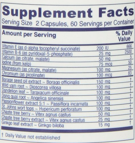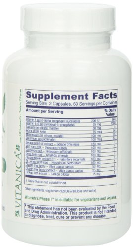 -. Binding : Health and Beauty -. Brand : Vitanica -. EAN : 0708118020216 -. Feature : Premenstrual support / Utilizing the latest in botanical research / Recommended by Dr. Hudson / 120 vegetarian capsules / This product may be fulfilled in an alternative package -. IsAdultProduct : 0 -. Label : Vitanica -. LegalDisclaimer : This is a statement of nutritional support. This statement has not been evaluated by the Food and Drug Administration. This product is not intended to diagnose, treat, cure, or prevent any disease. -. Manufacturer : Vitanica -. MPN : 01021-7 -. NumberOfItems : 1 -. PackageQuantity : 1 -. PartNumber : 01021-7 -. ProductGroup : Health and Beauty -. ProductTypeName : HEALTH_PERSONAL_CARE -. PublicationDate : 2011-04-11 -. Publisher : Vitanica -. Studio : Vitanica -. Title : Vitanica Women's Phase I, Premenstrual Support, 120 Capsules -. UPC : 708118010217