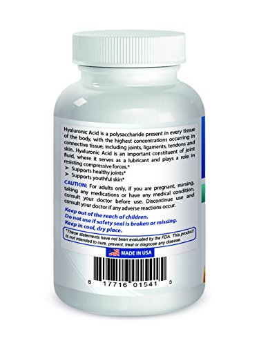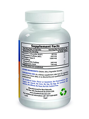 Best Naturals HYALURONIC ACID formula contains 100 mg HA per serving, complex with chrondroitin sulfate, Glucosamine Sulfate and COLLAGEN TYPE II ( bioavailabel for absorption), to alleviate joint pain and stiffness, and lubricate sagging, wrinkled skin & dry eyes