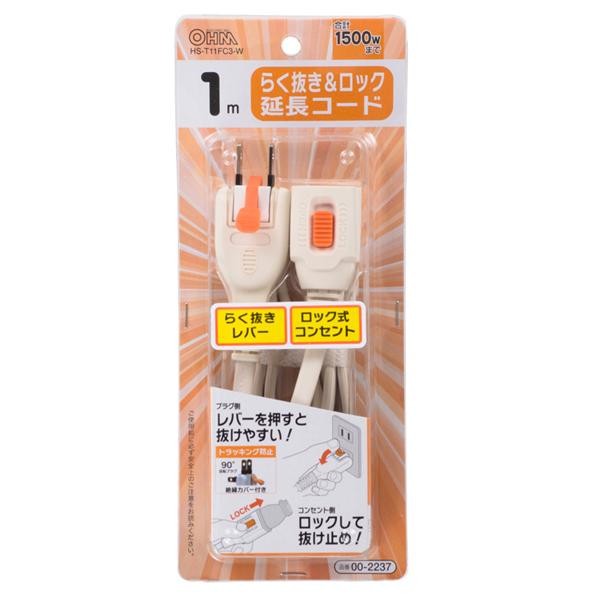 絶縁カバー付きプラグで、トラッキング火災を防止します。 生産国:中国 ※サプライヤー直送品 ご注文後2~3営業日後の出荷となります【商品名】OHM らく抜き&ロック 延長コード 1m HS-T11FC3-W