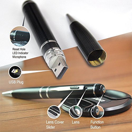 -. Feature : 1080P FHD Video Resolution: Just press the top button once the device automatically boots up and starts recording the video into 32GB memory built-in digital video recorder and our battery powered pen camcorder records 1080P color HD video at 30FPS, in full high definition with still shot functionality and crystal clear video / Three Modes: Mode 1 allows you take photo freely, Mode 2 for video recording and save to internal 16GB memory.Mode 3 for motion detection which largely saves the memory space and extends the recording time. You don't worry to miss important moments any more. / Easy To Use: It is ready to go out of the box without any complicated setup or configuration. and allows you to place it wherever you need it for easy covert surveillance. Just power on the camera and ready to record.Play back videos on your PC or Mac computer. / No Additional Software Request & Free 32GB Internal Memory: this camera pen is both PC and Mac Compatible. Date and Time stamps can be added as reference points on any recordings or images, so organizing your data is breeze. Our pen camera is made adhering to the highest manufacturing standards with a FREE 32GB internal memory included. / Premium Pen Design: Tired of cheap hidden camera? Our Pen Camera is designed as a high quality, everyday pen with hidden pinhole lens and includes 3 refills,USB cable and long lasting rechargeable battery for up to 110 minutes recording! 30 day money guarantee and 1 Year Warranty Click "Add to Cart" now!
