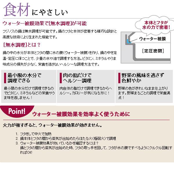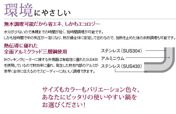 | 取っ手をシリコンとメラミンの樹脂製にして、持ったときの柔らかさを確保。さらに鍋を持つための補助取っ手を付け、鍋のフタの取っ手も順手、逆手どちらでも持つことができる形状にしました。ウォーター被膜効果で無水調理が可能。だから省エネ、エコロジー。 |