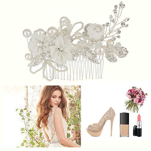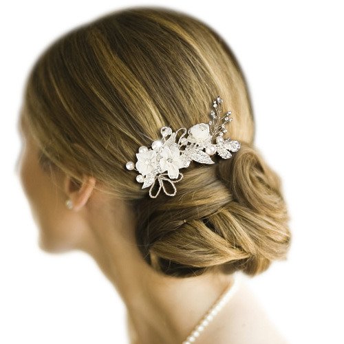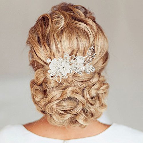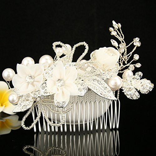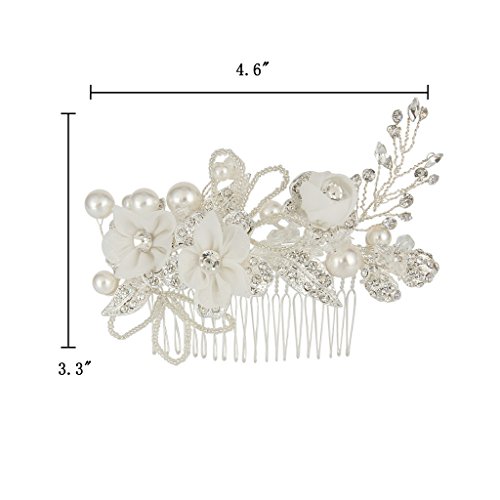 -. Title : EleQueen Women's Silver-tone Crystal Simulated Pearl Flower Leaf Bridal Hand-made Hair Comb Clear