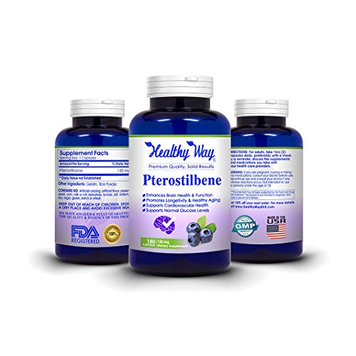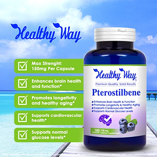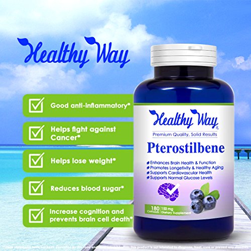 Studio : Healthy Way RX Publisher : Healthy Way RX Binding : Health and Beauty Product Description About Pterostilbene 100% NATURAL ANTIOXIDANT SUPPORT DNA REPAIR Pterostilbene?is a?stilbenoid?chemically smilar to?resveratrol which keeps DNA in good repair, preventing DNA damage. In plants, it plays a defensive?phytoalexin?role. Pterostilbene has been revealed to lower oxidative stress on cells, inhibit free radicals, and also to have anti-inflammatory effects. PROMOTE HEALTHY BLOOD SUGAR LEVELS The use of Pterostilbene supplement will promote the normal glucose and tri-glyceride levels for healthy people. It may be adequate for facilitating healthy blood sugar, brain health, and mood. SAFE EFFECTIVE Our pterostilbene 150mg capsules are 100% safe and effective because we use highest quality ingredients that can be gotten in the market. They effectively follow GMP compliance manufacturing standards. 100% MONEY BACK GUARANTEE PLUS FREE SHIPPING: If within a period of 30 days you are, in any way, discontent with any of our product just send it back to us and we will "fully refund" your purchase price. Our first priority is customer satisfaction. 0