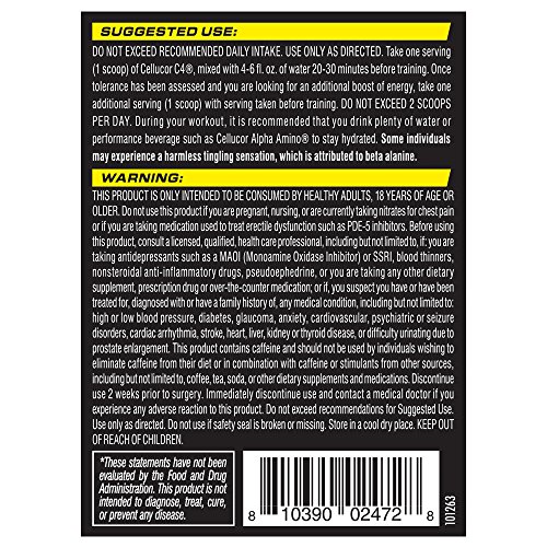 -. Feature : Energy & Performance for Next Level Results: The days of mediocre workouts are over. Feel the momentum, and experience high level energy and performance from start to finish, with C4. C4's premium formula packs ingredients that get you energized and in the zone. Improved training sessions means even better results. / America's Number 1 Selling Pre-Workout+: Cellucor's C4 is a trusted pre-workout for men and women of all training levels. C4 has proven to be a leader in its category, and has earned the title of America's Number One Selling Pre-workout. / Unbeatable Flavors: C4 is well known and respected for offering a variety of great tasting flavors that continue to raise the bar. / Premium Ingredients: C4 is a trusted pre-workout that promises quality of ingredients and purposefully crafted blend of patented ingredients that promote energy and endurance for better workouts.* / 100% Satisfaction Guarantee: All Cellucor sales from Amazon.com are guaranteed to give you an edge in performance. We understand the importance of investing in your health, so we extend a 30-day, full money-back guarantee. We are so confident you will love the product and see transformative results that we are happy to put our money where our mouth is.