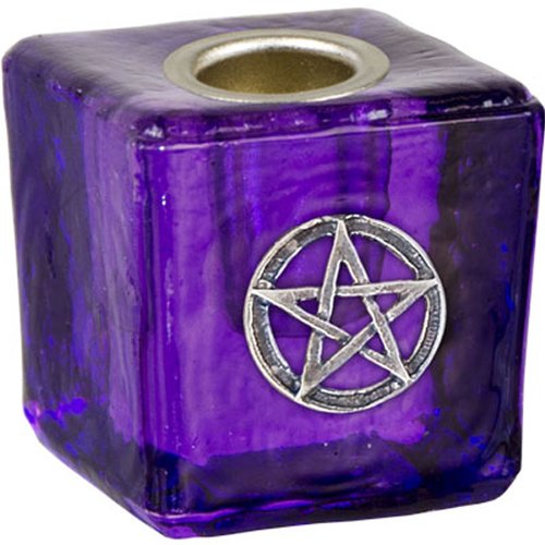 This simple yet elegant cube candle holder is made of purple glass and features a silver toned Pentacle in the center.