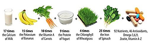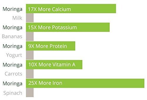 The leaves are loaded with vitamins, minerals, essential amino acids, and more. Gram for gram, Moringa leaf powder contains: 15X more Potassium than Bananas 10X more Vitamin A than Carrots 25X more Iron than Spinach 17X more Calcium than Milk 8X more Magnesium than Kale 20Xmore Vitamin E than Tofu 7X more Vitamin C than Oranges