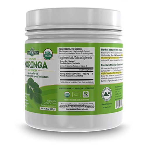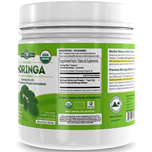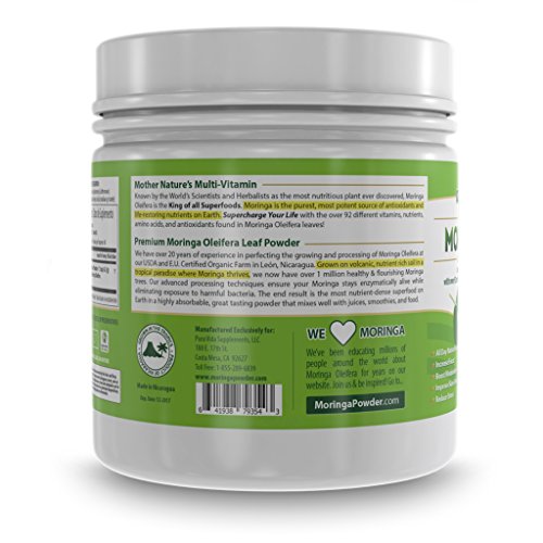 Studio : Pura Vida Supplements Publisher : Pura Vida Supplements Binding : Health and Beauty Product Description We've set the Gold Standard at our Moringa Farm Most Moringa products on the market are not single-sourced. They are most likely sourced from China or India using mechanized harvesting. This process is dangerous as it pulverizes entire young Moringa trees adding unsafe amounts of heavy metals due to the abundance of stems and branches making it into the final product. Our State-of-the-Art Moringa Farm Processing Facility is 100% dedicated to Moringa products. By combining the best of Organic Farming and High-Tech Processing we are able to preserve most of Moringa's treasure trove of life-giving nutrients. Pura Vida's process starts with every leaf being hand peeled. The Most Nutrient Dense Plant on Earth? Moringa is considered to be the most nutrient-rich plant ever known to mankind.