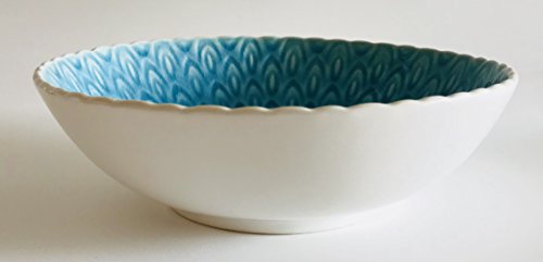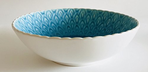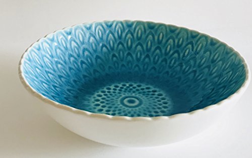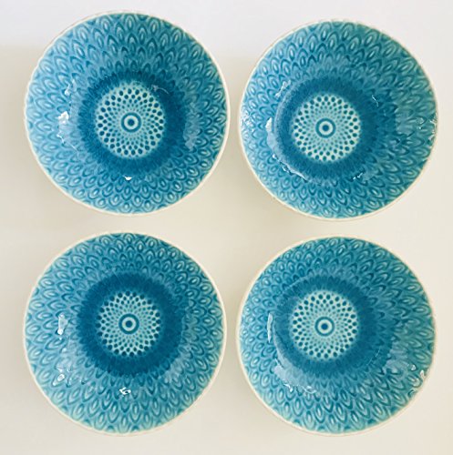 Turquoise Peacock Pattern Crackled Glaze Round Stoneware | Set of 4 Soup Bowls | 6.75 inches x 2 inches