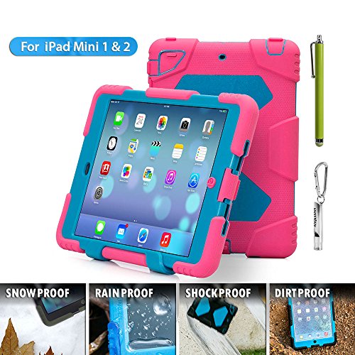 Pepkoo Ipad Mini 1& 2 Case Plastic Kid Proof Extreme Duty Dual Protective Back Cover with Kickstand and Sticker for Ipad Mini 1&2 - Rainproof Sandproof Dust-proof Shockproof (Black/blue)
