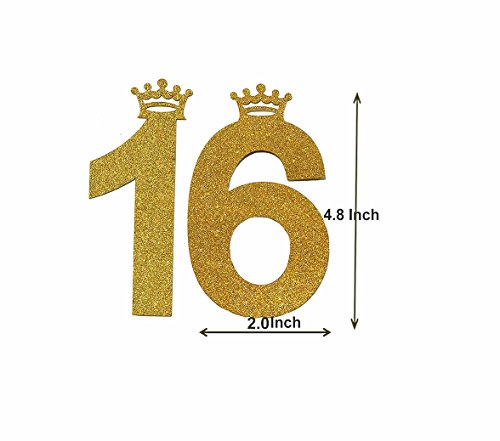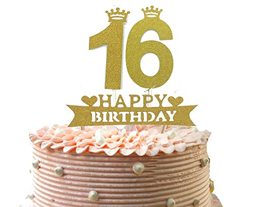 16th Cake Topper and Sixteen Happy Birthday Party Supplies Decoration, Gold,4.8" Length