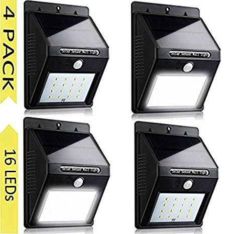 Solar Outdoor Security Lights, Sujonna Wireless Waterproof and Heatproof Motion Sensor Auto ON/OFF 16 LED Wall Lights for Patio, Garden, Pathway, Fence, Deck, Yard, Driveway - 4 pack