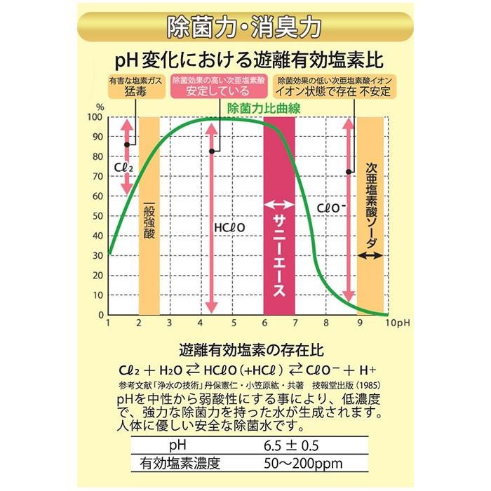 | 除菌力のモトは、塩酸(HCI)と次亜塩素酸ナトリウム(NaCIO)の溶液を希釈混合して生成された水。pHを中性から酸性にする事により、低濃度で、強力な除菌力を持った水が生成されます。人体に優しい安全な除菌水です。ウイルス・カビ・菌などの対策に、病院・介護施設・食品製造場・役所などの人の出入りが多い場所で広く利用されています。 |