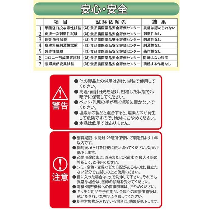 | 仕様 | 消費期限:1年間 pH:6.5±0.5 有効塩素濃度:50~200ppm ノズル付き 取扱説明書(箱に記載) |