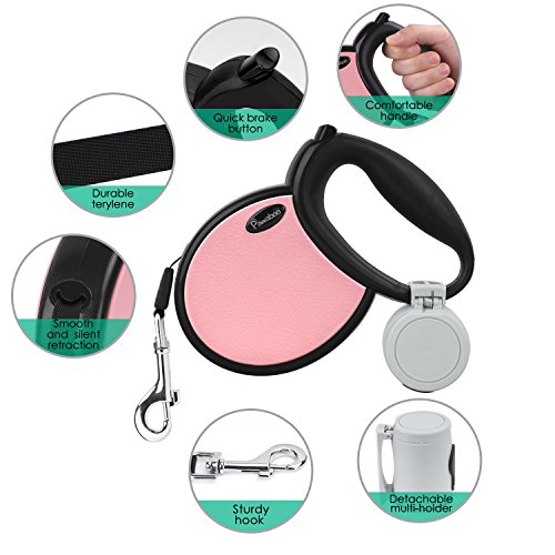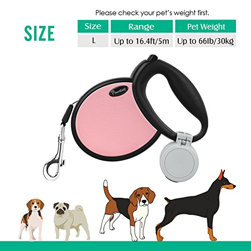 Studio : Pawaboo Publisher : Pawaboo Binding : Misc. Product Description Pawaboo Automatic Retractable Dog Leash: Best for you to go walking, running and hiking with your dog freely, enjoy the convenience of controlling your dog. Product Description: ? 5M / 16.4 FT automatic retractable traction belt is flexible to extend, give your pet more freedom to move; Easy to shorten lenth, bring your pet close. ? With precise and robust mechanism, this durable and light terylene leash retracts smoothly and silently. Button cycles through 15,000 times tests without jamming. ? With a detachable holder, convenient to store either poop bags or treat food(15 poop bags included). ? Easy to operate. Quick brake button control locks the leash with just a thumb action. ? Big soft handle for easy and comfortable gripping. ? Suitable for small to medium sized dogs(up to 30kg / 66lbs). Please check your pet's weight before purchase.