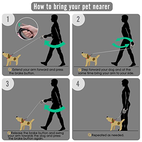 How to Bring Your Pet Nearer: 1. Extend your arm forward and press the brake button. 2. Step forward your dog and at the same time bring your arm to your side. 3. Release the brake button and swing your arm towards the dog and press the brake button again. 4. Repeated as needed.