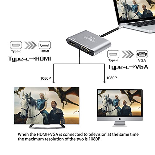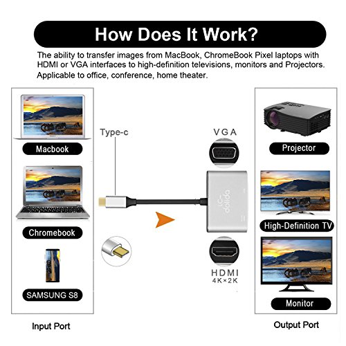 - 【Compatible Models】Type C to HDMI VGA Adapter Support Models: 2015 MacBook/2016 MacBook 12"/13"/15" /2016 MacBook Pro /2017 MacBook /2017 MacBook pro with Touch Bar/Dell XPS12(9250)/Dell XPS13(9350)/Dell XPS15(9550)/Dell Precision5510/HP Spectre X2/HP Spectre X360/HP Elitebook Folio G1/HP Elite X2 1012 G1/Acer Switch Alpha 1/Acer Spin7/Acer Chromebook R13/Google Chromebook Pixel/Lenovo 900/Lenovo 910/Samsung s8/Samsung S8 plus/HuaWei MateBook