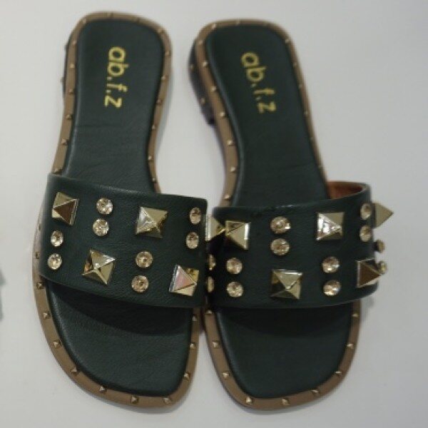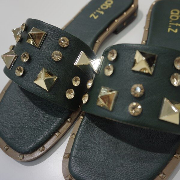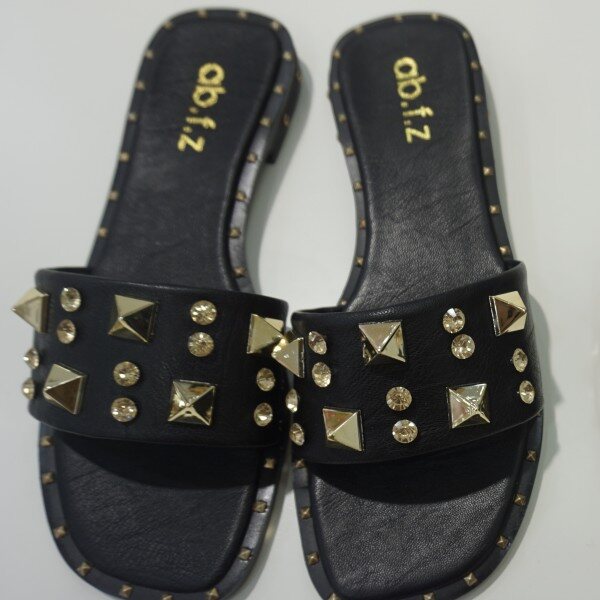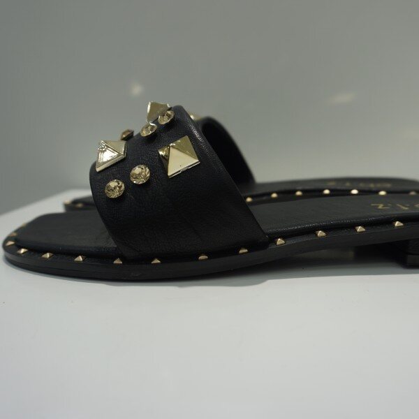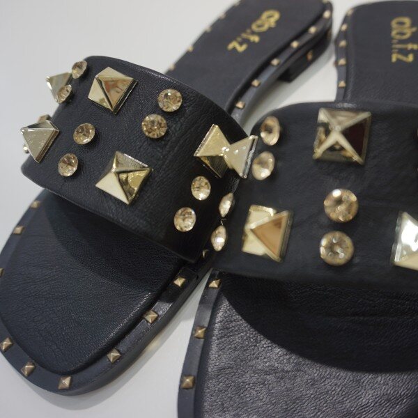 화려한 스터드가 포인트되는 플랫슬리퍼입니다