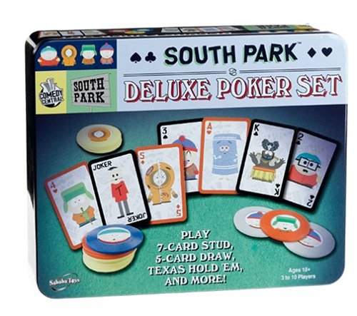 Ante up with Cartman, Kenny, Kyle, Stan and the South Park gang with a little game of 7-card stud, 5-card draw, Texas hold ’em, and more with this South Park deluxe poker set. The set includes 180 chips with chip rack, decorative tin, 54-card deck and a rulebook featuring your favorite South Park characters. For 3–10 players 18 years and up. Imported.