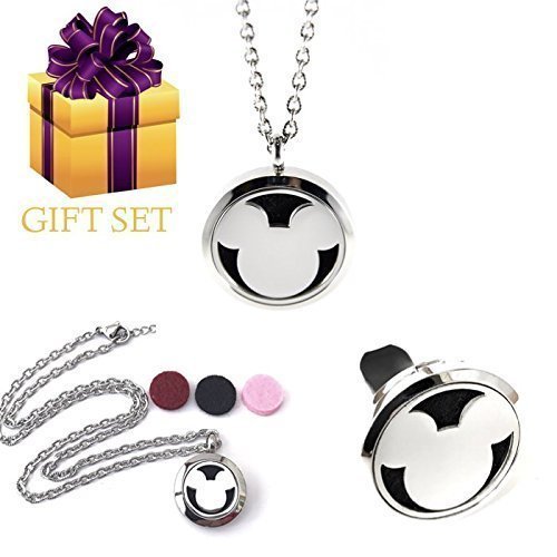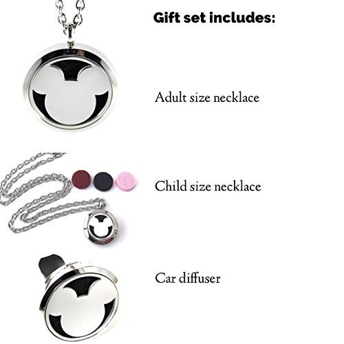 Mickey Mouse Aromatherapy Essential Oils Gift Set With Adult and Child Pendant Necklace With Car Diffuser. Extra Colored Oil Pads included. Great for any Disney Fan