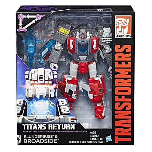-. Feature : Voyager Class Broadside and Titan Master Blunderbuss figures / Blunderbuss figure becomes the head for the Broadside figure / Broadside figure is a Triple Changer figure / Broadside figure links with Titans Return Fortress Maximus figure (sold separately) / Includes Voyager Class Broadside figure, Titan Master Blunderbuss figure, 5 weapon accessories, character card with tech specs, and instructions.