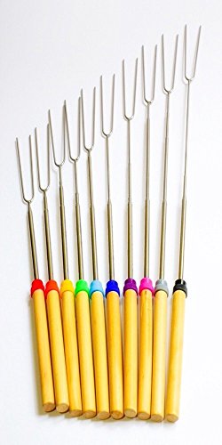 Product Description Set of 10 telescoping roasting forks for memorable times around the camp fire. Includes: ? 10 Multi-Color Coded Wood Handles, Stainless Steel Telescoping Forks ? Convenient Storage Travel Zipper Pouch 0