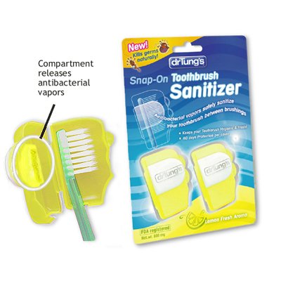 Studio : Dr. Tung's Publisher : Dr. Tung's Binding : Health and Beauty Product Description Kids Snap-On Toothbrush Sanitizer 2 ct PackHow it works: Research reveals that toothbrushes harbor a host of harmful bacteria that can re-infect your mouth when you brush. Granules in a uniquely designed compartment-treated with special essential oils- release disinfecting vapors to kill germs and effectively neutralize bacterial growth on your childs toothbrush. A clean, safe, hygienic toothbrush helps protect your childs mouth from infection. ECO-FRIENDLYOur Snap-On Sanitizer made with GeoSolv will biodegrade when placed in a landfill. Kills germs naturally drTungs Snap-On Toothbrush Sanitizer