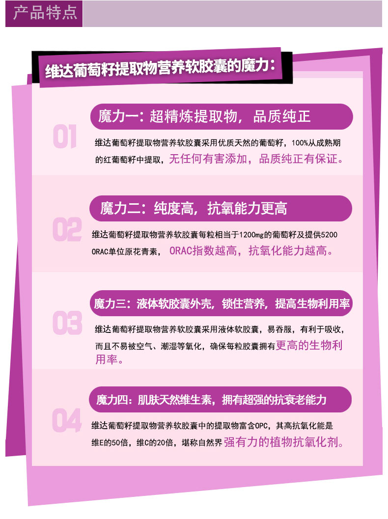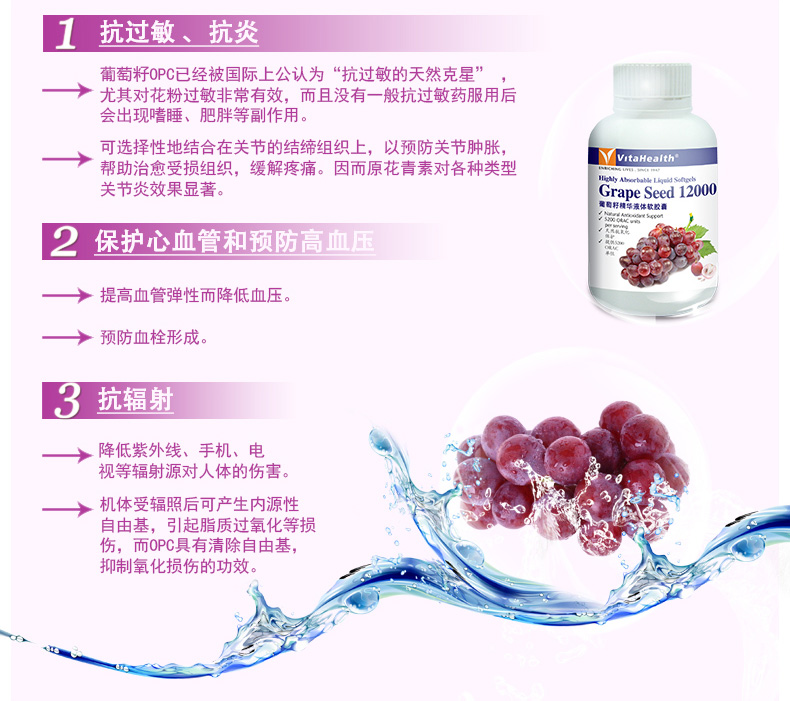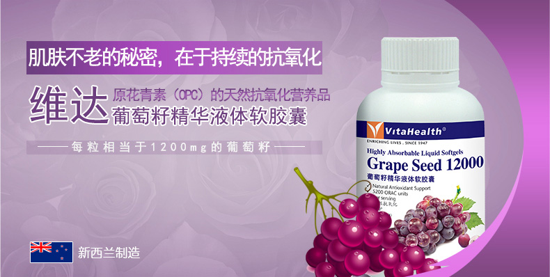 VitaHealth Grape Seed 12000 is a antioxidant supplement which contains naturally occurring oligomeric proanthocyanidins (OPCs) which are powerful antioxidants found in the seeds of the red grapes. It is formulated in highly absorbable liquid filled softgels to allow body to absorb Grape Seed OPCs easily.