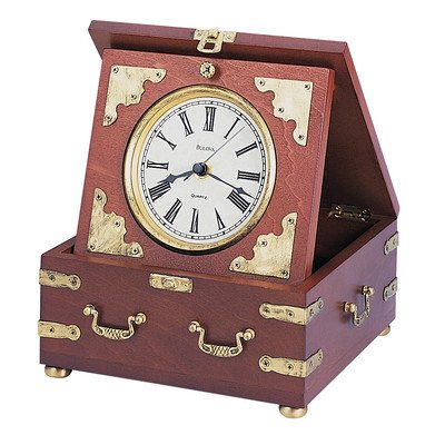 B7450 Features: -Solid wood hinged case. -Antique gold tone bezel. -Protective glass lens. -Recommended battery type: AA. Product Type: -Tabletop/Mantel. Style: -Traditional. Time Display: -Analog. Finish: -Dark Wood. Wood / Wood Base: -Yes. Generic Dimensions: -9'' H (open). Dimensions: Overall Height - Top to Bottom: -3.75 Inches. Overall Width - Side to Side: -7.5 Inches. Overall Depth - Front to Back: -7.5 Inches.Feature