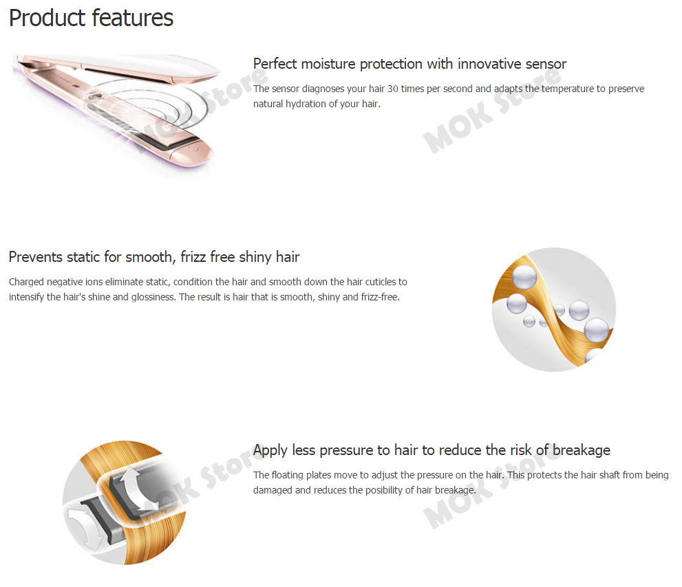 Philips MoistureProtect Straightener MoistureProtect technology Ionic Floating ceramic plates HP8372. Preserve your hair’s natural hydration For a healthy shine Sensor technology protects the moisture balance of your hair. The sensor diagnoses your hair 30 times per second and adapts the temperature to preserve natural hydration.