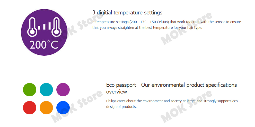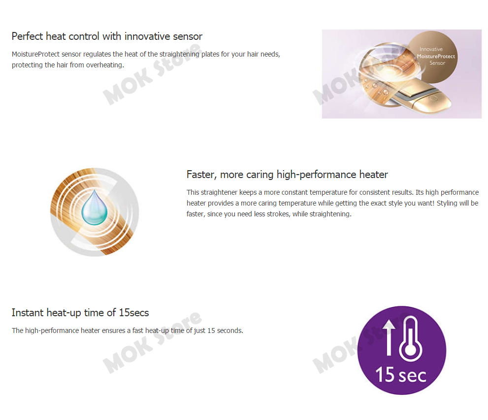 The result is hair that is smooth, shiny and frizz-free. MoistureProtect sensor MoistureProtect sensor regulates the heat of the straightening plates for your hair needs, protecting the hair from overheating. MoistureProtect technology The sensor diagnoses your hair 30 times per second and adapts the temperature to preserve natural hydration of your hair. Temperature control 3 temperature settings (200 - 175 - 150 Celsius) that work together with the sensor to ensure that you always straighten at the best temperature for your hair type.