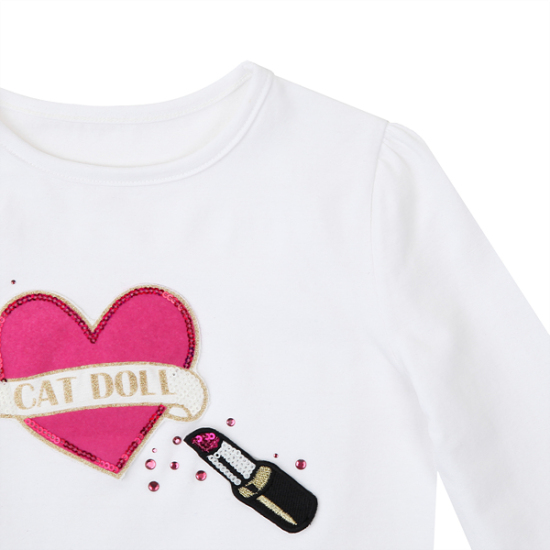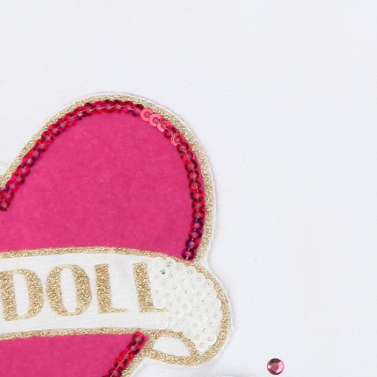 상세설명-소매단이 플레어로 스타일로되어있어 멋스러우며 앞부분에 하트와 립스틱 큐빅이 포인트로 코디해서 입기 편한 티셔츠입니다