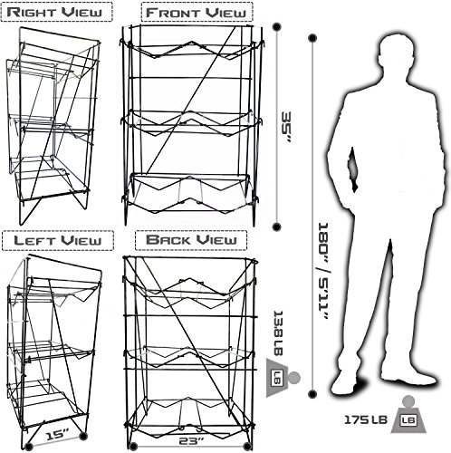 ✔️ INNOVATION - 34" H x 23" W x 15" L. That's it! Other brands are almost 5 to 6 feet tall. Yet, it can fit (6), 5 gallons bottles with no sweat. Just under 14 pounds, but can support 20+ times its own weight! Never worry about it bending or breaking, ever! Stainless Steel wire/rod is about the same thickness as a pen.