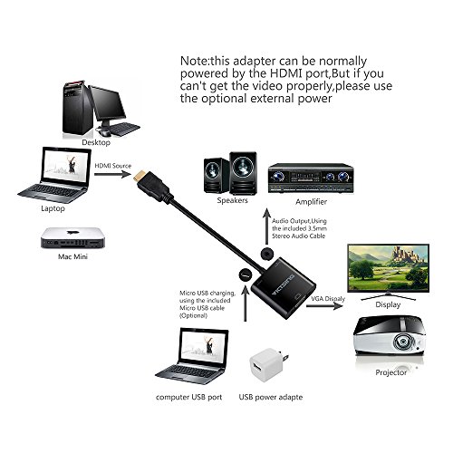 HDMI to VGA convertor adapts to laptop computer, apple TV3 ,camcorder and other device with HDMI port to VGA port adapts to projectors, HDTV, monitors and other device with VGA male port. 3.5mm audio port can connect to speaker, headphone, amplifier and other devices. Please plug the micro USB power adapter when HDMI port connects to low power device.
