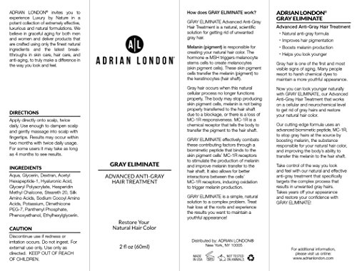 ADRIAN LONDON Gray Eliminate Advanced Anti-Gray Hair Treatment (2oz) 60ml. Naturally treats hair loss by inhibiting DHT, Stimulates hair regrowth, Anchors hair more firmly. Our scientifically advanced treatment is designed to get to the root causes of hair loss. This product is manufactured in United States.Feature