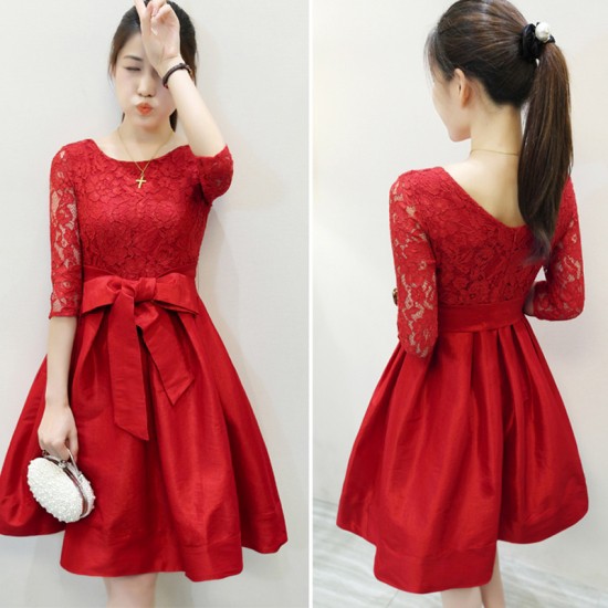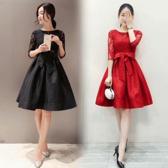 ワンピース ひざ丈 レディース ドレス シースルー 花柄 レース リボン ハイウエスト 可愛い エレガント お呼ばれ パーティー drgz0639