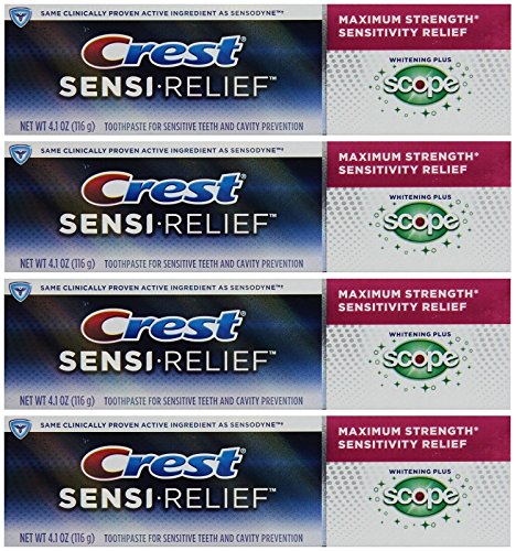 -. Binding : Health and Beauty -. Brand : Crest -. Color : Whitening + Scope, Minty Fresh -. EAN : 0714270013195 -. Feature : Pack of 4 tubes, Each is 4.1 ounce / Provides the same clinically proven active ingredient as Sensodyne*.*This product is not manufactured or distributed by GlaxoSmithKline, Distributor of Sensodyne. / Maximum strength + sensitivity relief with the power of Scope. / Experience the freshness of Scope's longest-lasting technology. / Whitens teeth by removing surface stains. -. Label : Crest -. Manufacturer : Crest -. PackageQuantity : 4 -. ProductGroup : Health and Beauty -. ProductTypeName : HEALTH_PERSONAL_CARE -. Publisher : Crest -. Size : 4.1 Oz (Pack of 4) -. Studio : Crest -. Title : Crest Sensi-Relief Whitening + Scope Minty Fresh Toothpaste, 4.1 Oz (Pack of 4) -. UPC : 714270013195