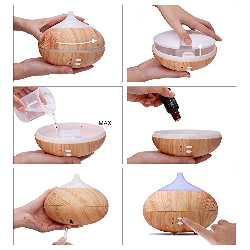 5: Adopted Ultrasonic Technology: Ultrasonic diffuser uses less oil than other diffusers and vaporizes without the use of heat. It gives out ultra fine and smooth mist which can soften and moisten dry and chapped skin in winter. It also helps you breathe better when your're sleeping with air conditioner on.