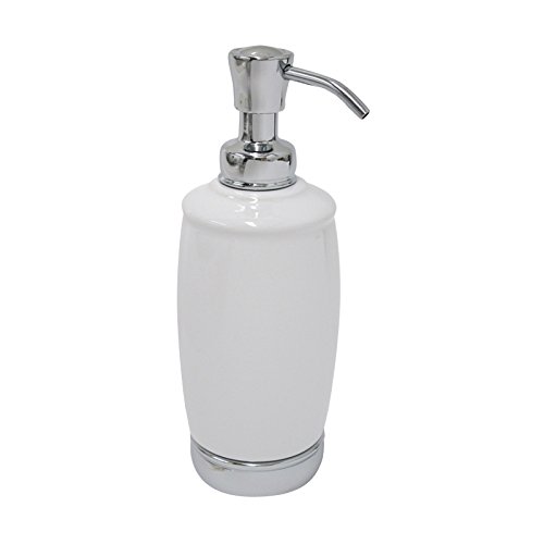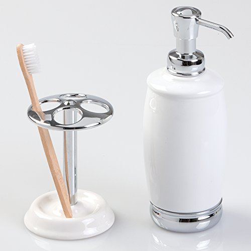 mDesign Ceramic Soap or Lotion Dispenser Pump with Toothbrush Holder Stand, 2 pc Bathroom Accessory Set - White/Chrome