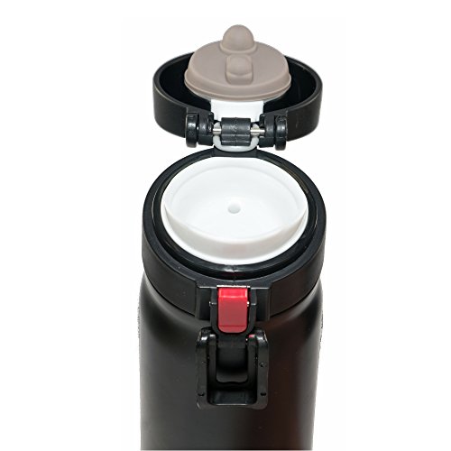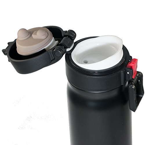 - LEAK-PROOF - You can turn it upside down, shake it up, roll it, the liquid will not spill. Drink lid opens with push button ease and locks closed for carefree travel. This water bottle stays cool to the touch with hot liquids and is condensation-free with cold. Capacity: 17 ounce light and compact design for effortless transport and storage and fits most automobile drink holders.
