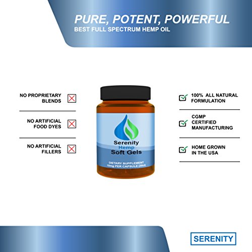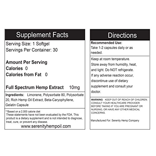 Full Spectrum Hemp oil is one of nature's most perfectly balanced oil packed with phytonutrients and essential fats. Serenity Hemp gives you a balanced 3:1 ratio of Omega 6 and Omega 3 fatty acids along with a dose of amino acids, antioxidants, vitamins and minerals to give your body the boost and protection it needs. This product will also help your body relax and give you a stress free state of mind without the "high" effects. Our product is safe and comes in an easy to consume softgel. Hemp oil is one of the most underrated superfoods that is missing from your diet and will benefit your body in numerous ways. You will receive 10mg of hemp extract per softgel. As always, if you are not satisfied with our product, please contact us.