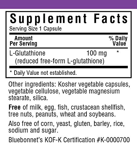Bluebonnet's L-Glutathione 100 mg capsules provide the pharmaceutical grade, free form amino acid L-glutathione in its purest crystalline form. Available in easy-to-swallow vegetable capsules for maximum assimilation and absorption.Feature