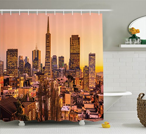 Ambesonne Apartment Decor Collection, San Francisco Skyline at Sunset California USA Downtown Panorama Picture, Polyester Fabric Bathroom Shower Curtain Set with Hooks, Peach Mustard Ivory Gray