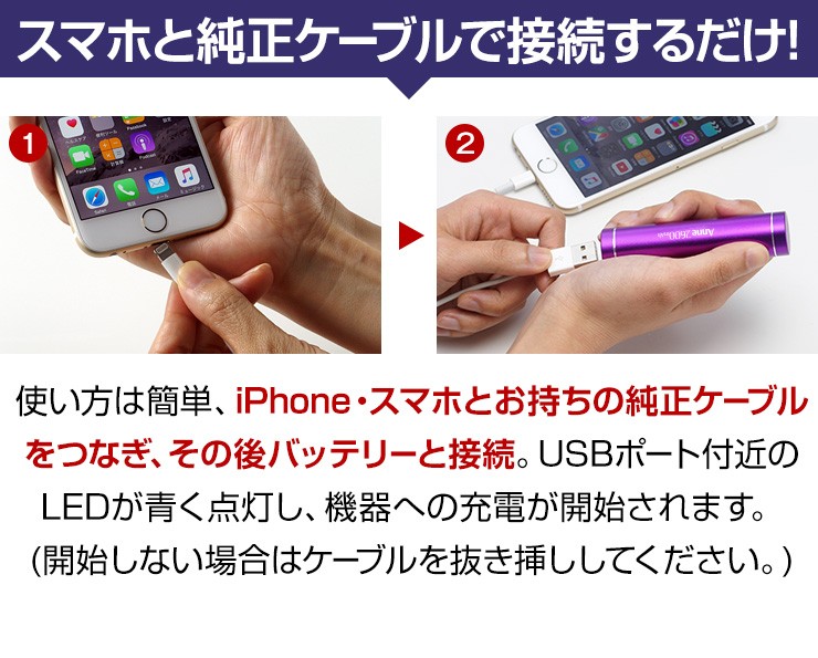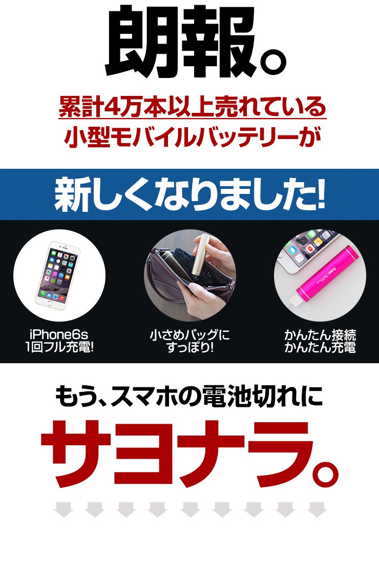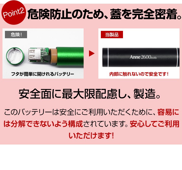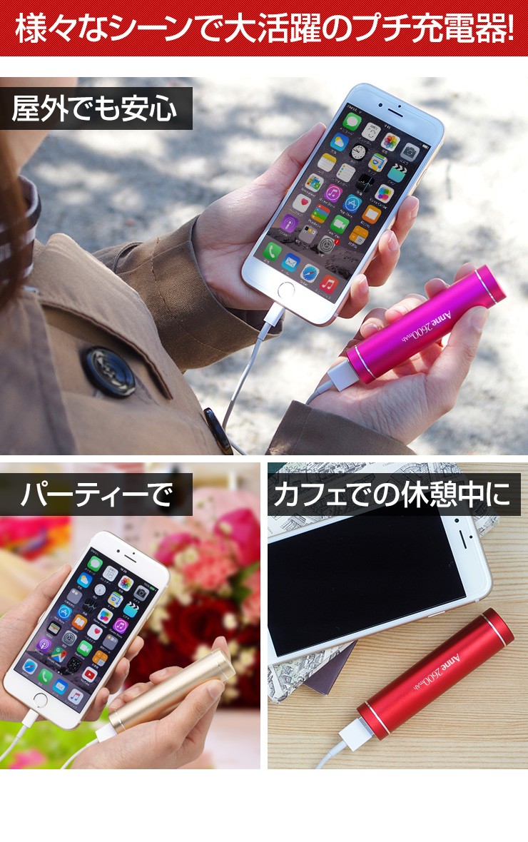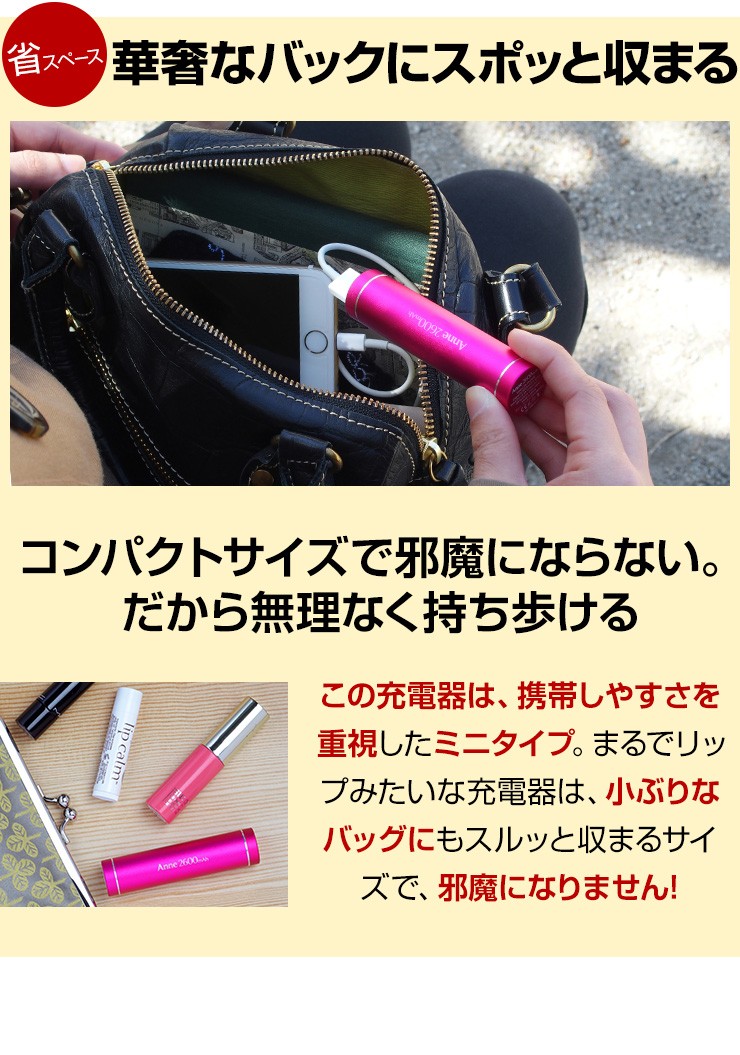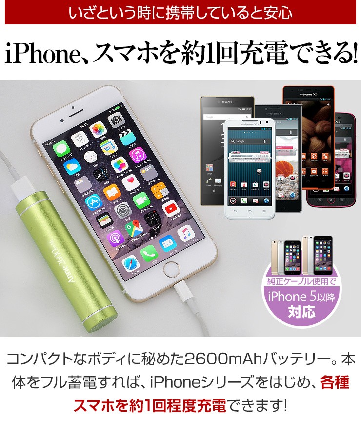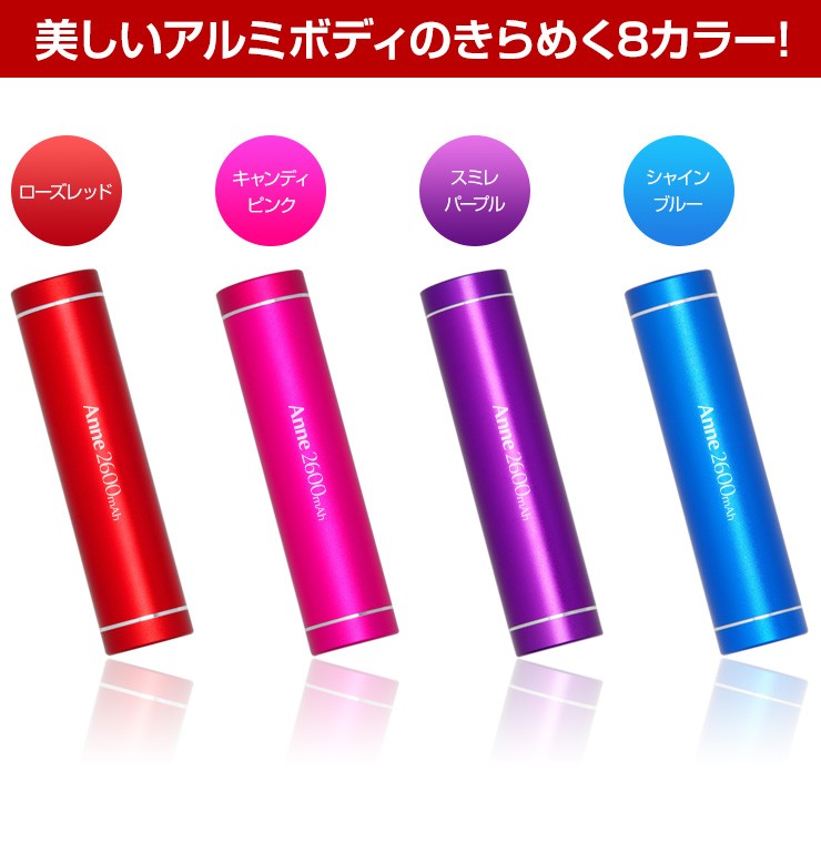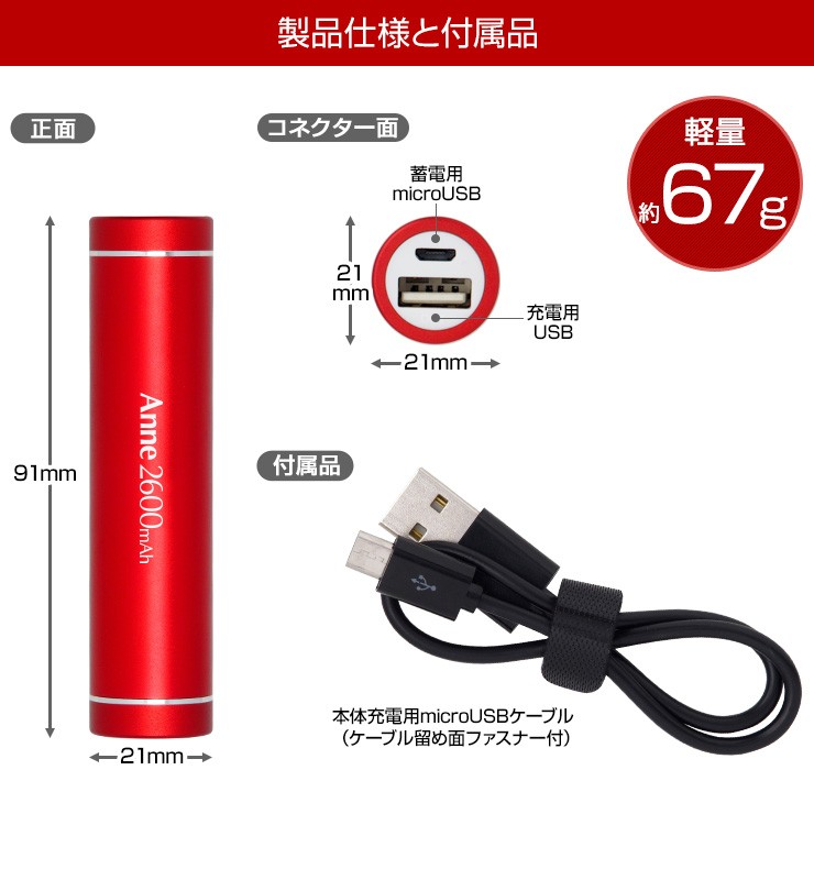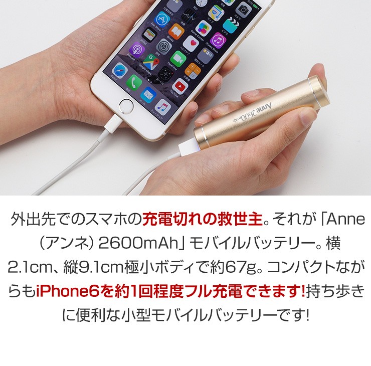 iPhone、スマホを約1回フル充電できる!持ち運びに特化した極小サイズのスティックバッテリー「Anne(アンネ)2600mAh」登場!スマホの充電切れの不安を解消!【製品特徴】●およそ2cm×9cmと化粧ポーチにも入る極小サイズ!●約67gとiPhone6の約半分の重さ!●iPhone、スマホを約1回フル充電できる2600mAh!●美しいアルミボディに選べる8カラー!●付属のmicroUSBケーブルは面ファスナー付きで持ち運びに便利!●安心の保証期間180日間!デジキン