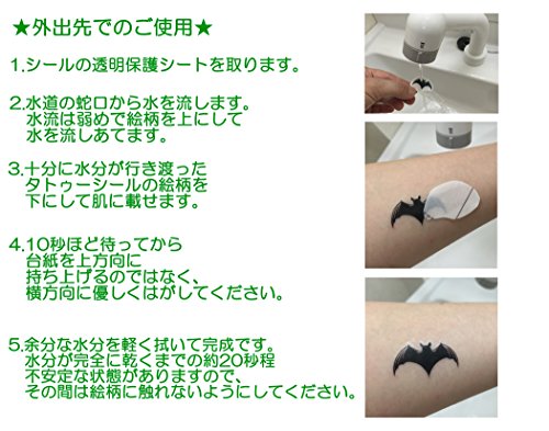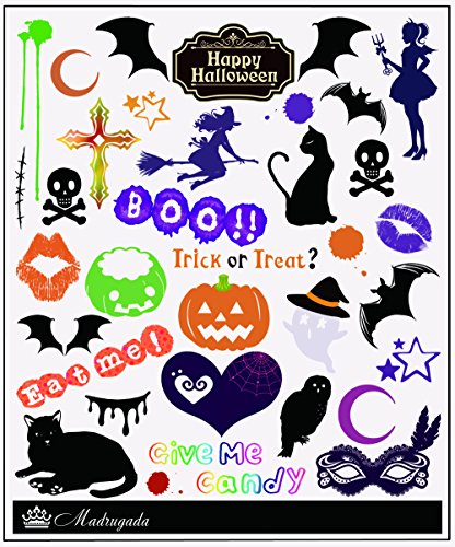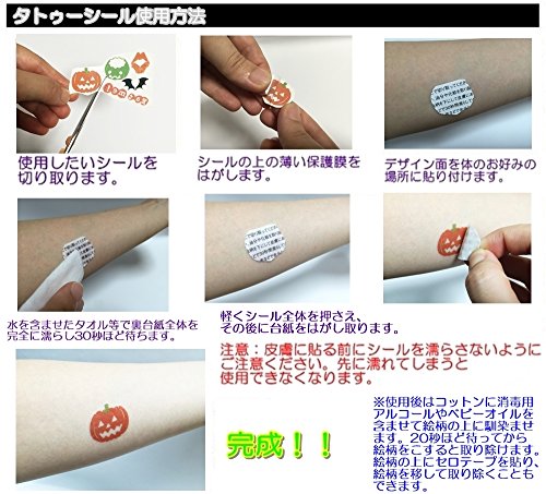 ハロウィンにかかせないキャラや文字がたっぷりのタトゥーシールがセットに! お肌にやさしく、水でどこでも簡単に貼ることができるハロウィンタトゥーシールまでセットになっております(アメリカ食品医薬品局『FDA』認可原材料のみ使用)。 シールサイズ:縦152mm×横127mm